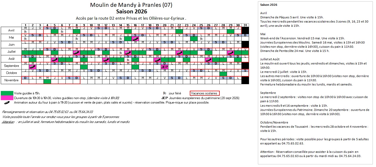 Informations pratiques pour la visite du moulinOuverture du moulin en 2026